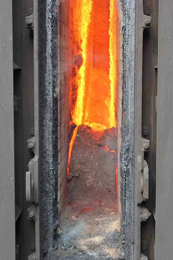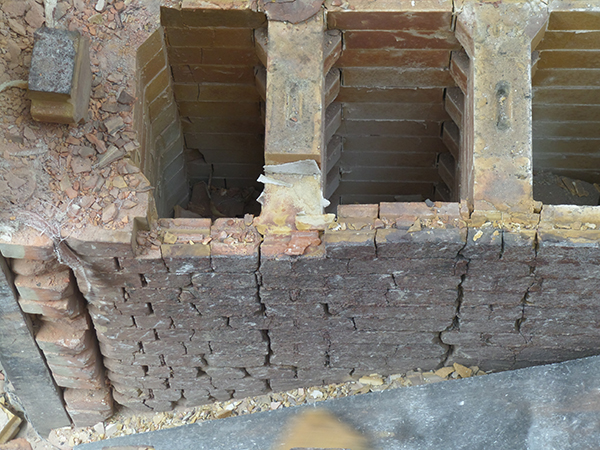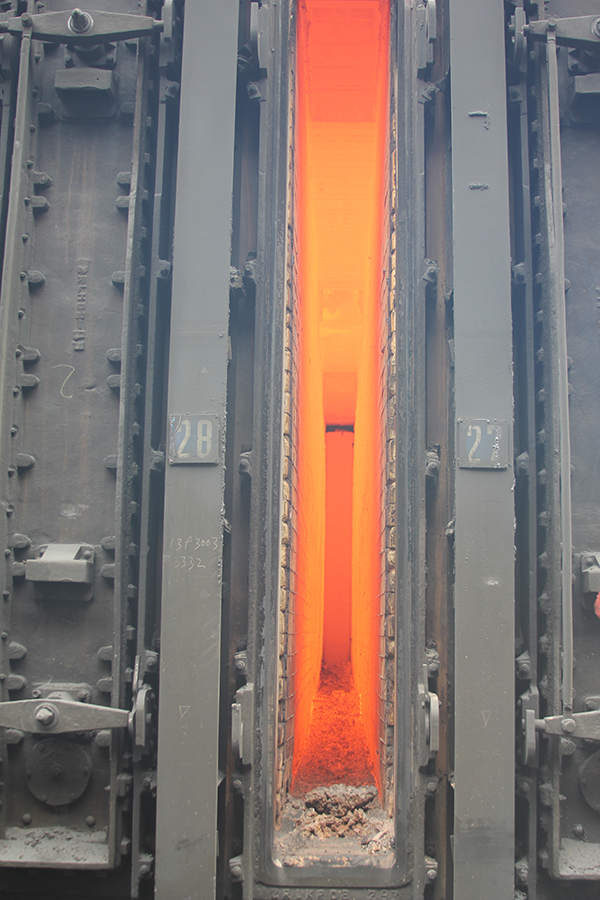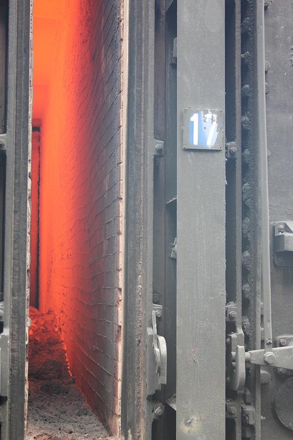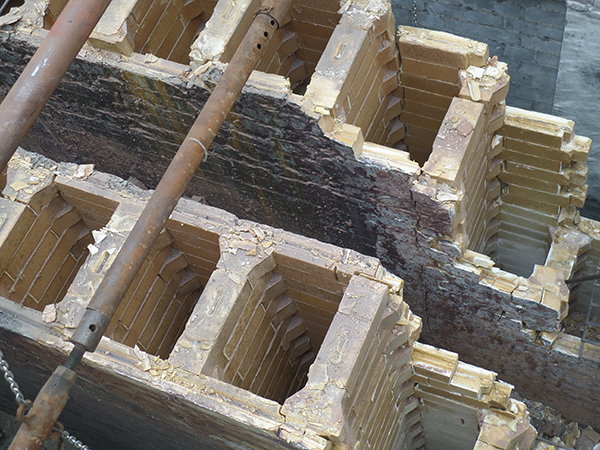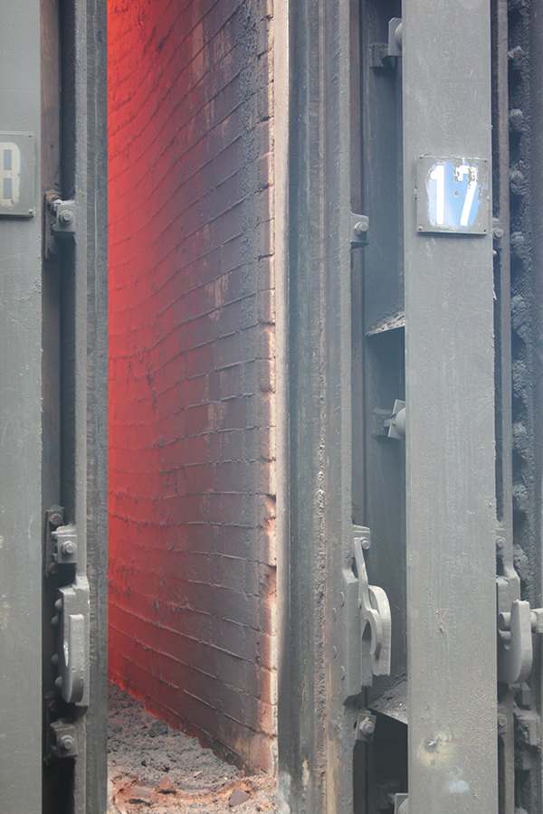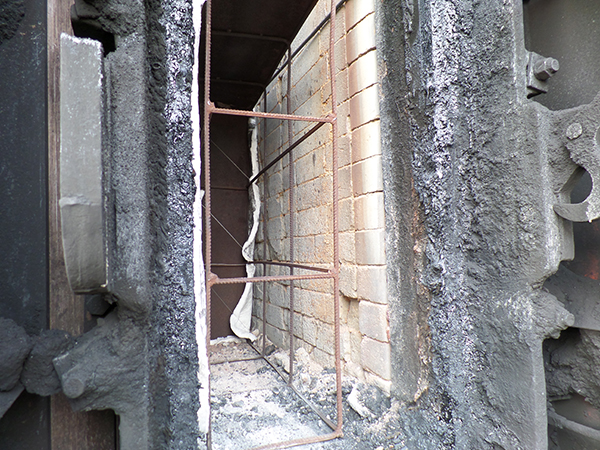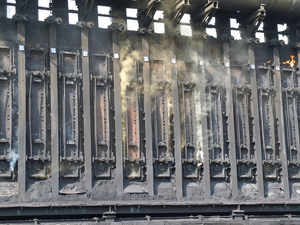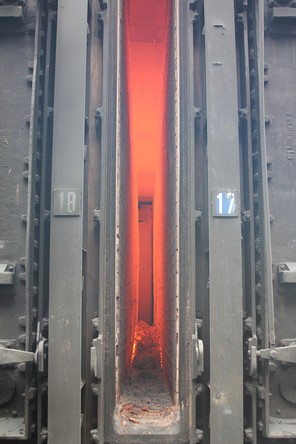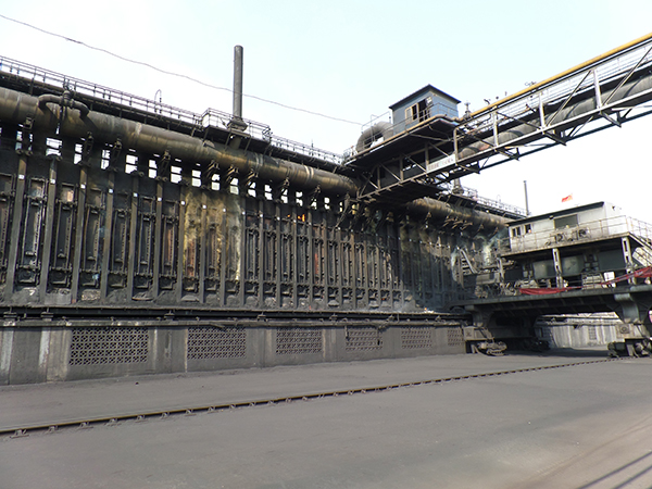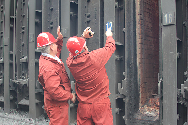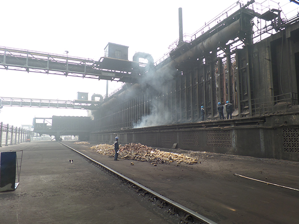 河北集团丰达矿业钢铁公司1#、2#焦炉(TJL4350D型)分别2005年和2008年投产。我公司在2013年9月—2014年2月(施工中)采用俄罗斯热态维修专利技术,对1#、2#焦炉14个炭化室进行揭顶贯通热态维修。对30面炭化室炉墙进行陶瓷焊补热态维修。